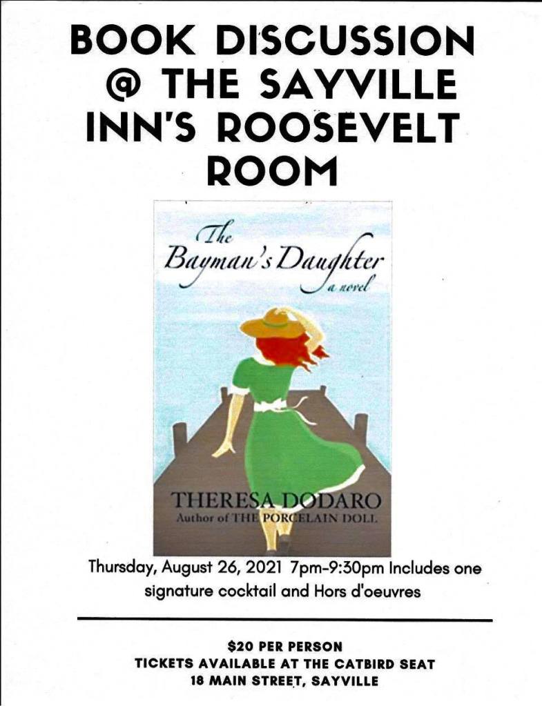 Thursday, August 26th, 2021: Book Discussion for The Bayman’s Daughter at The Sayville Inn’s Roosevelt Room, 199 Middle Road, Sayville, NY. $20 per person includes a signature cocktail (The Bayman’s Daughter) and Hors d’oeuvres in the original Nohowec’s Saloon that was a favorite meeting place for Teddy Roosevelt and his Sayville cousins, John Ellis Roosevelt and Bert Roosevelt. (7pm to 9:30pm)