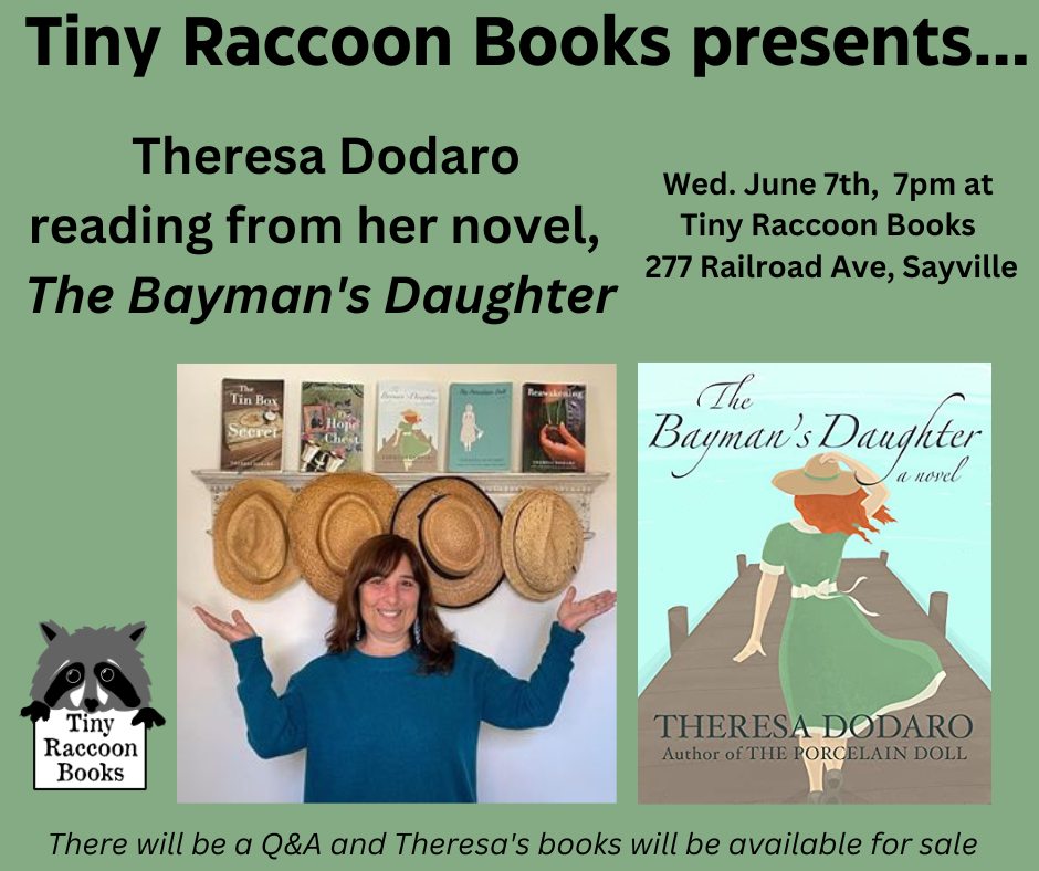 Wednesday, June 7, 2023: Tiny Raccoon Books at 277 Railroad Avenue, Sayville. Author Reading/Discussion/Signing at 7 p.m.