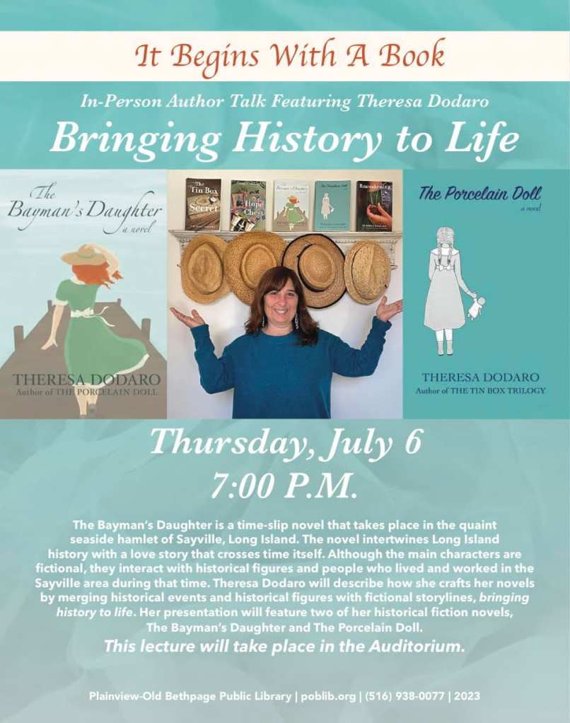 Thursday, July 6th, 2023: Merging of Historical Events and Historical Figures with Fictional Storylines Can Bring History to Life. The Bayman’s Daughter. @ Plainview-Old Bethpage Library. 7 p.m. to 8 p.m.